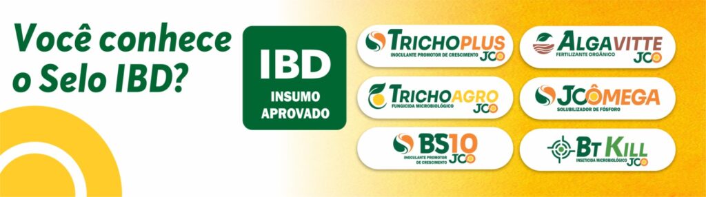 Atualmente na JCO Bioprodutos temos 6 produtos com o Selo IBD: o Trichoplus, o Trichoagro, JCOmega, BS10, BTKILL e o AlgaVitte garantindo a sustentabilidade conduzida em campo.